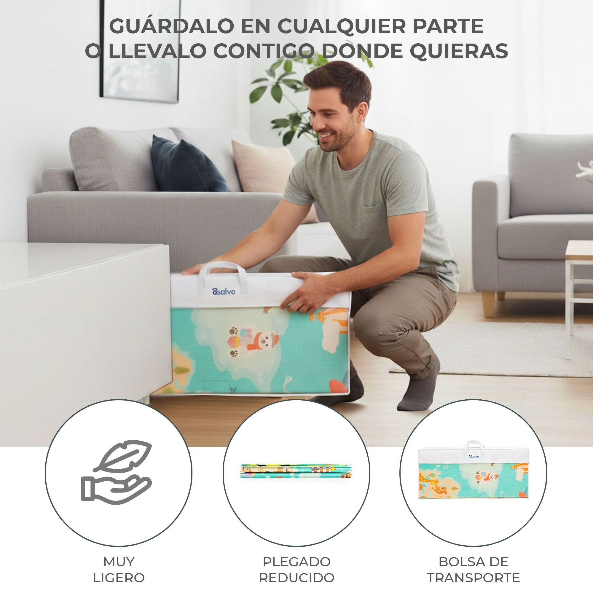 La Alfombra de Juegos Plegable XXL ofrece un amplio espacio acolchado de 200 x 180 cm donde el bebé puede jugar, gatear y explorar con total comodidad. Su diseño reversible y lleno de colores estimula el juego y la imaginación, mientras que su superficie suave y antideslizante garantiza seguridad en cada movimiento. Gracias a su formato plegable, se recoge y transporta fácilmente, convirtiéndose en una opción práctica para usar tanto en casa como fuera de ella. Una alfombra funcional, resistente y perfecta para acompañar al pequeño en su día a día.