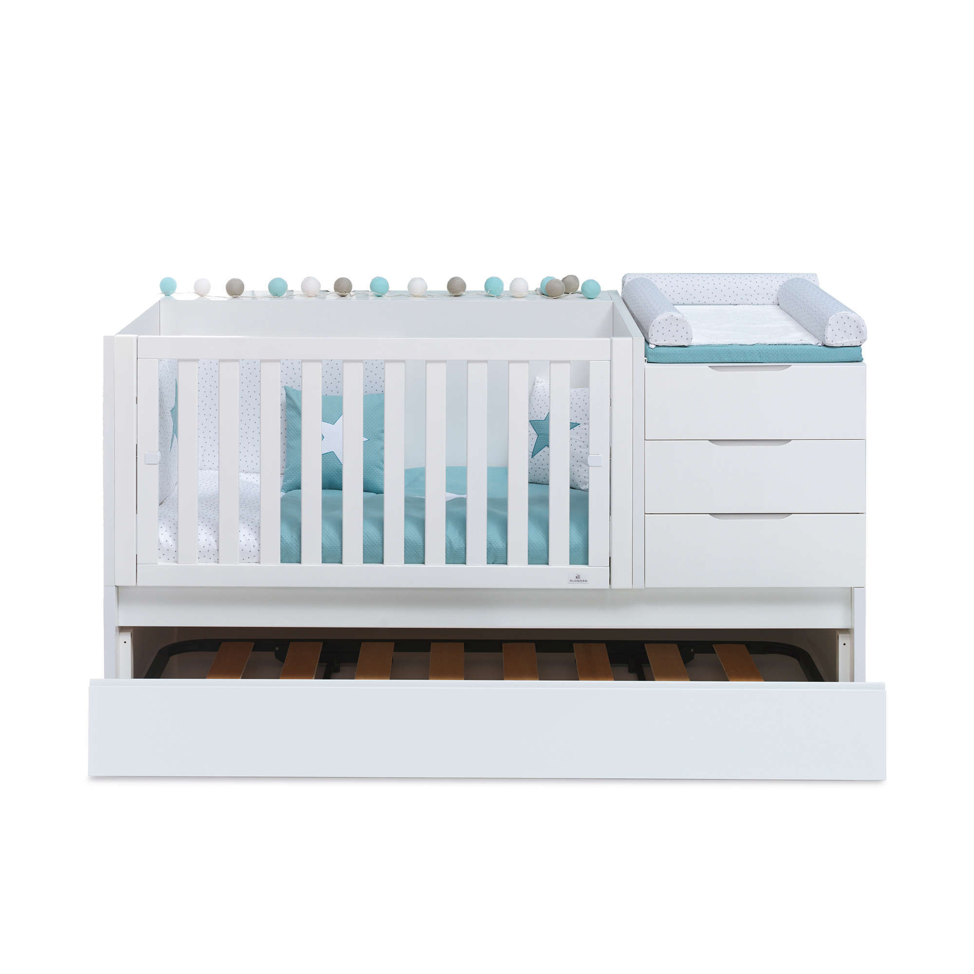 Enamórate de la alegría que desprende la cuna convertible en cama y escritorio Sero More Mare. Las tonalidades verde agua están a la última y, además, transmiten la naturalidad y la calma del mar. ¡Perfecto para un dormitorio de bebé convertible! Es una cuna evolutiva, por lo que cubrirá todas las etapas de crecimiento de tu peque. Y, por si fuera poco, puedes vestirla como desees con las diversas combinaciones y packs textiles disponibles.- Somier nido metálico con lamas de contrachapado y ruedas de plástico con banda de goma