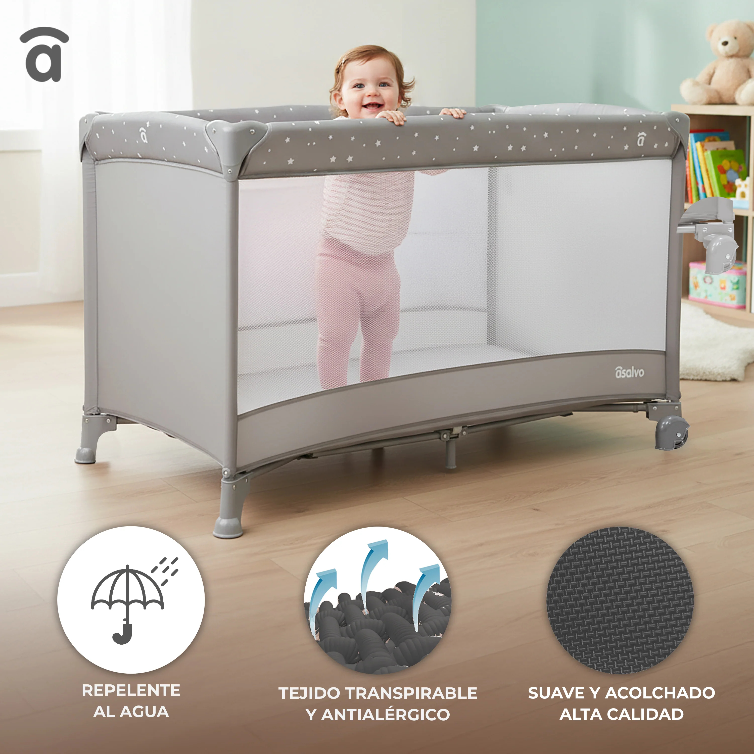 Este producto multifuncional para bebés sirve tanto como cuna para bebés como parque infantil para niños pequeños, adaptándose fácilmente a las necesidades de su hijo. Fabricado con un robusto armazón de acero, garantiza durabilidad y seguridad, con esquinas protegidas y ruedas equipadas con frenos para una movilidad segura. Todos los materiales han sido probados y son seguros para los niños, lo que proporciona tranquilidad. Fácil de montar y plegar, ahorra espacio cuando se guarda e incluye una bolsa de viaje para una máxima portabilidad. Disponible en atractivos colores, añade estilo a cualquier cuarto infantil o salón. Los laterales de malla transpirable garantizan una ventilación óptima y permiten una fácil supervisión, mientras que su diseño fácil de limpiar simplifica la vida diaria de los padres ocupados