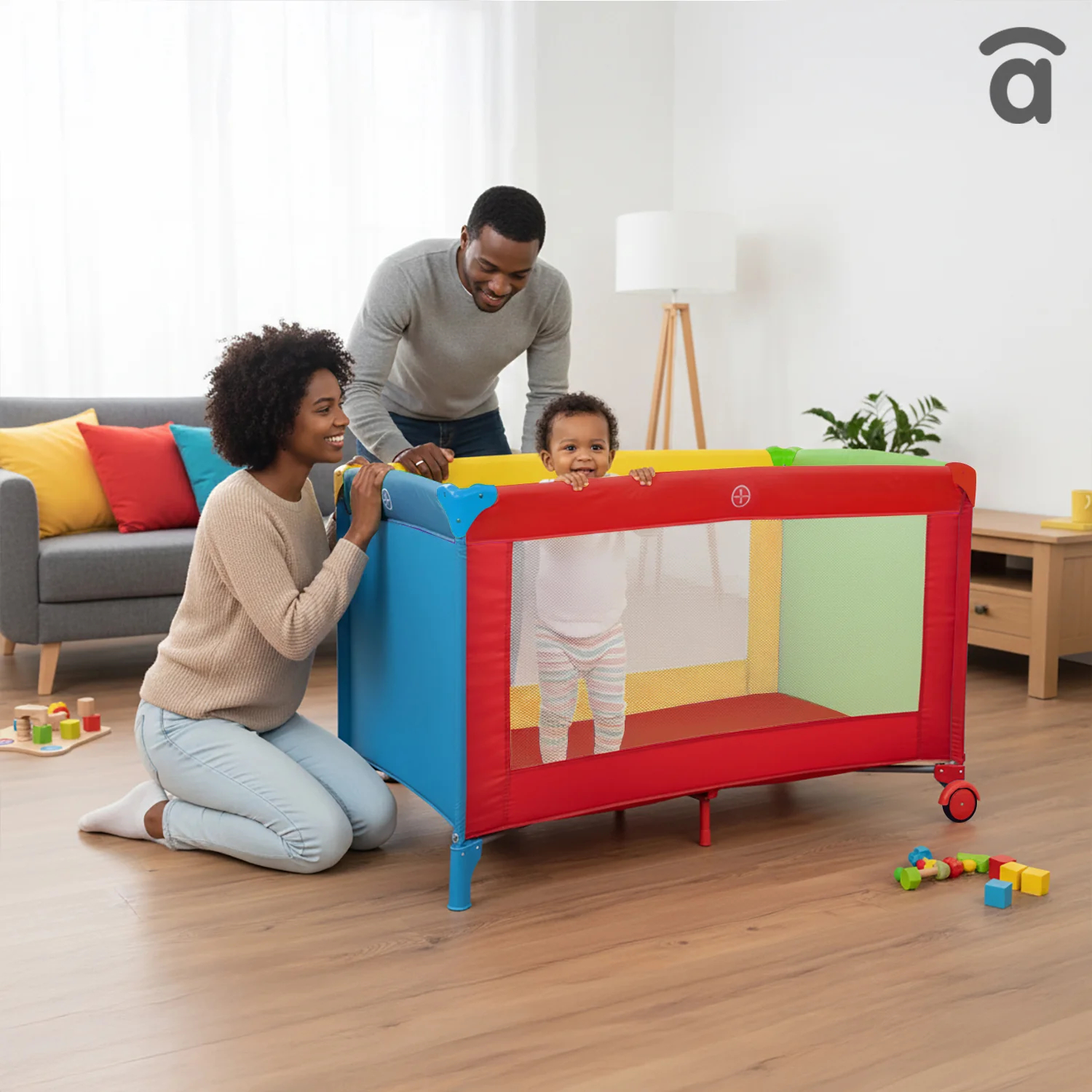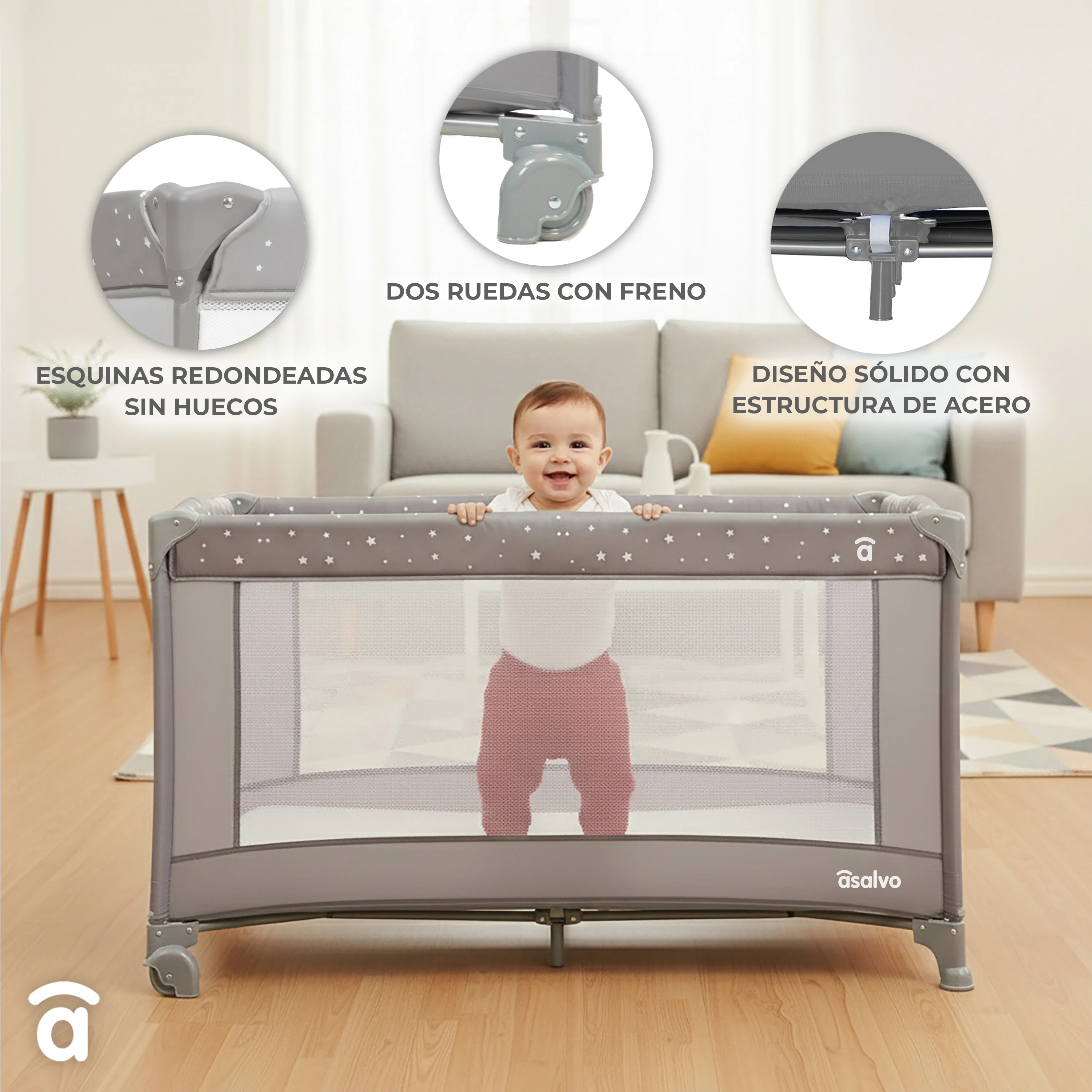 Multifuncional, sirve tanto como cuna para bebés como parque infantil. Fabricado con un robusto armazón de acero, garantiza durabilidad y seguridad, con esquinas protegidas y ruedas equipadas con frenos para una movilidad segura. Todos los materiales han sido probados y son seguros para los niños, lo que proporciona tranquilidad. Fácil de montar y plegar, ahorra espacio cuando se guarda e incluye una bolsa de viaje para una máxima portabilidad. Los laterales de malla transpirable garantizan una ventilación óptima y permiten una fácil supervisión, mientras que su diseño fácil de limpiar simplifica la vida diaria de los padres ocupados.