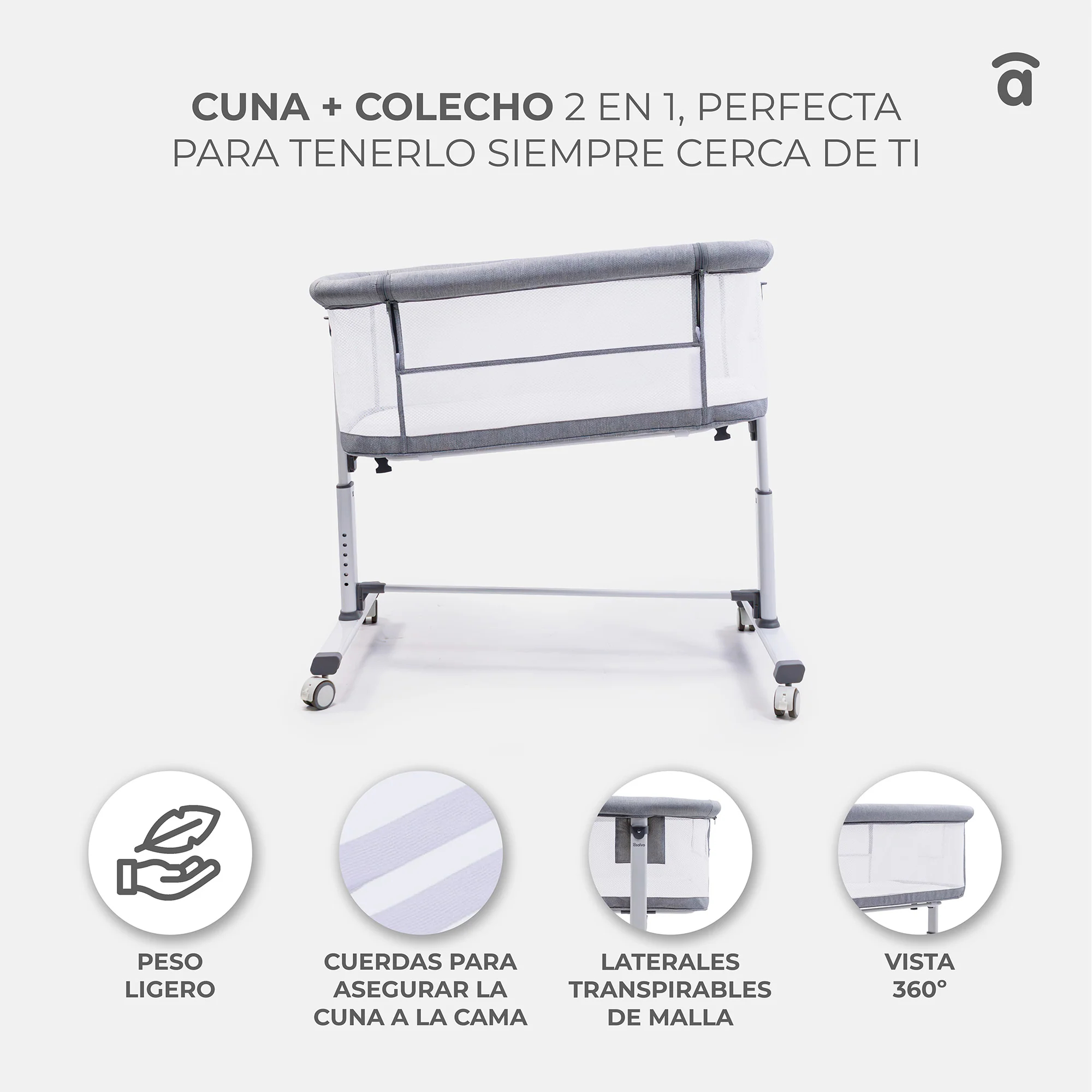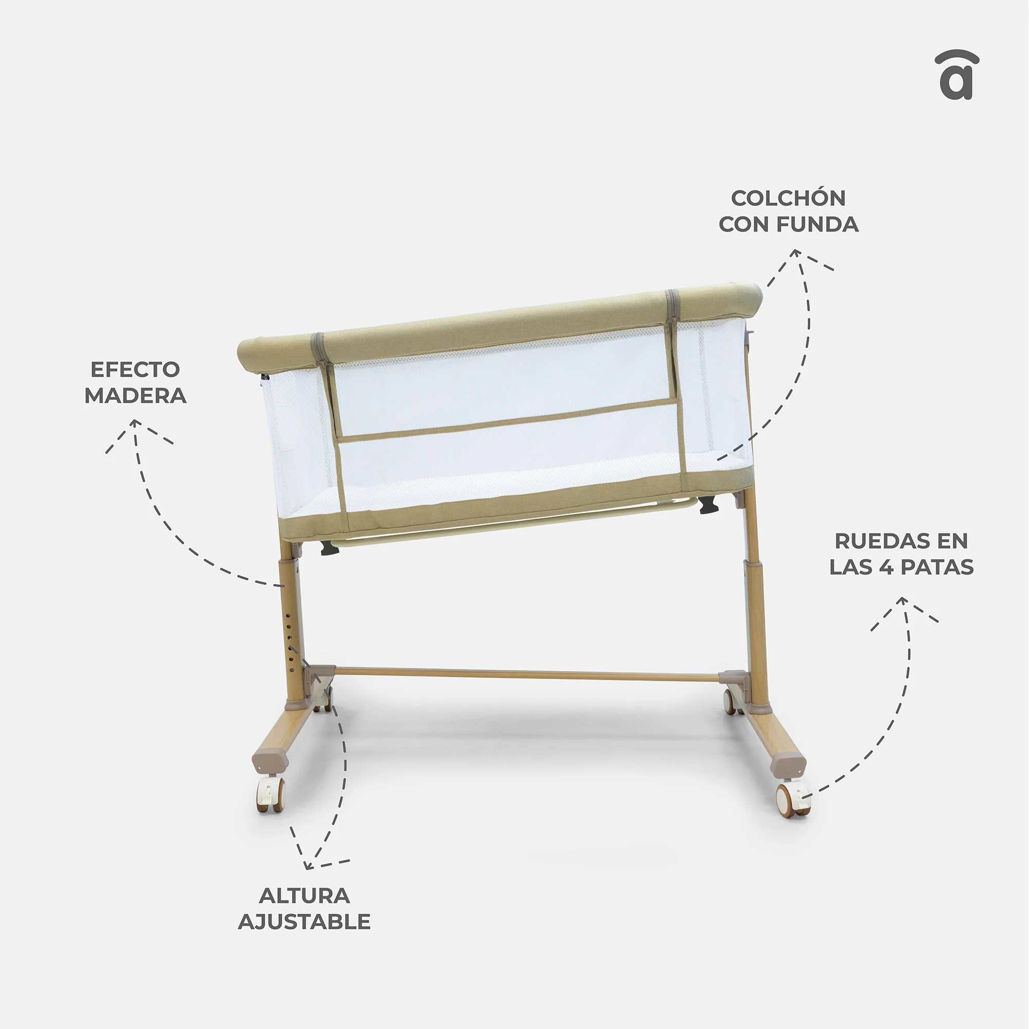 Estructura de acero Vista de 360º de tu bebé Incluye 4 ruedas Incluye colchón con funda Bolsa de transporte Correas de seguridad para fijar a la cama Tejido desenfundable y lavable Laterales transpirables y abatibles Ajustable en altura (6 posiciones) Fácil de montar y desmontar Muy ligero Uso como cuna de colecho o independiente