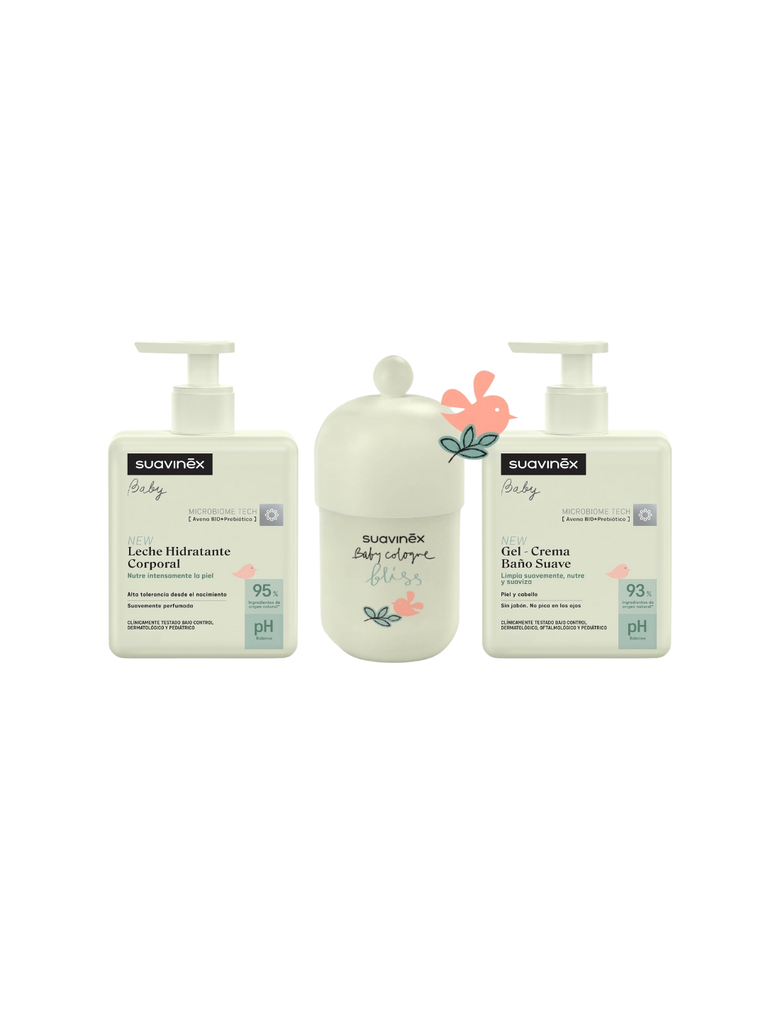 La colonia, la leche hidratante y el gel de baño del Suavinex Set Bliss están enriquecidos con ingredientes suaves y respetuosos con la delicada piel del bebé, como la camomila y la caléndula.