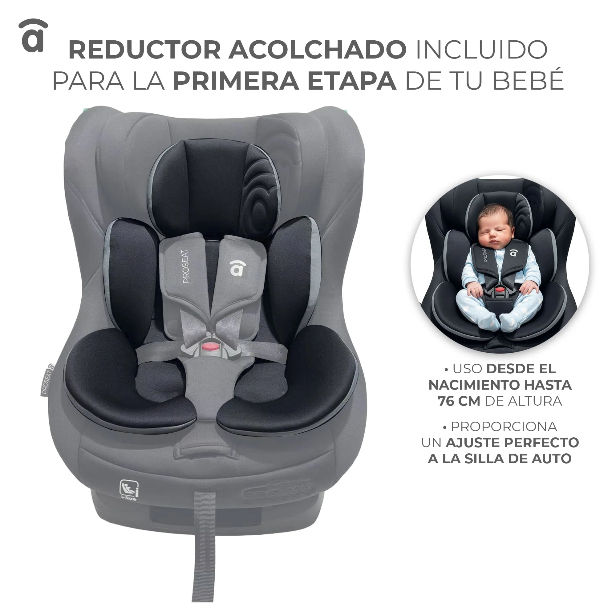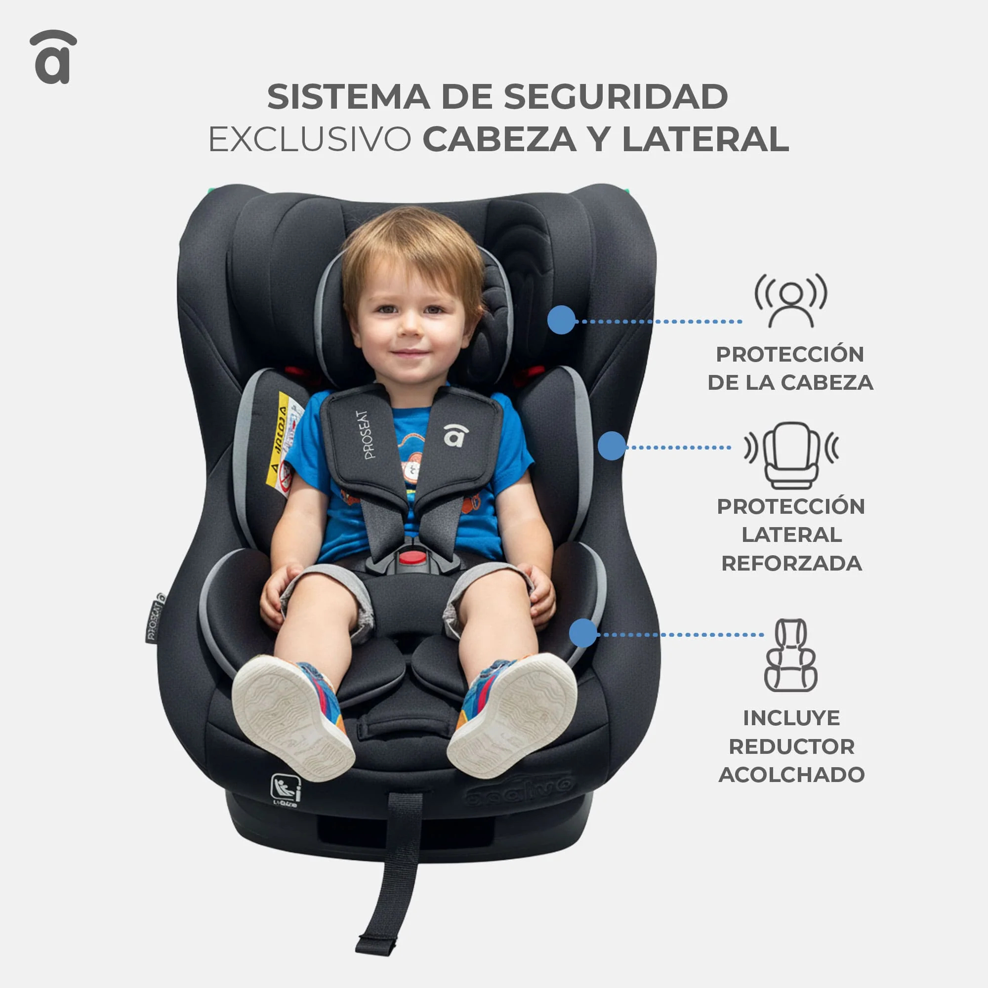 Instalación: cinturón de seguridad Tejido desenfundable y lavable Protección contra impactos laterales Respaldo ajustable 3 posiciones (sentido marcha) Reposacabezas ajustable Reductor Arnés de 5 puntos Molde de inyección y PP (polipropileno)