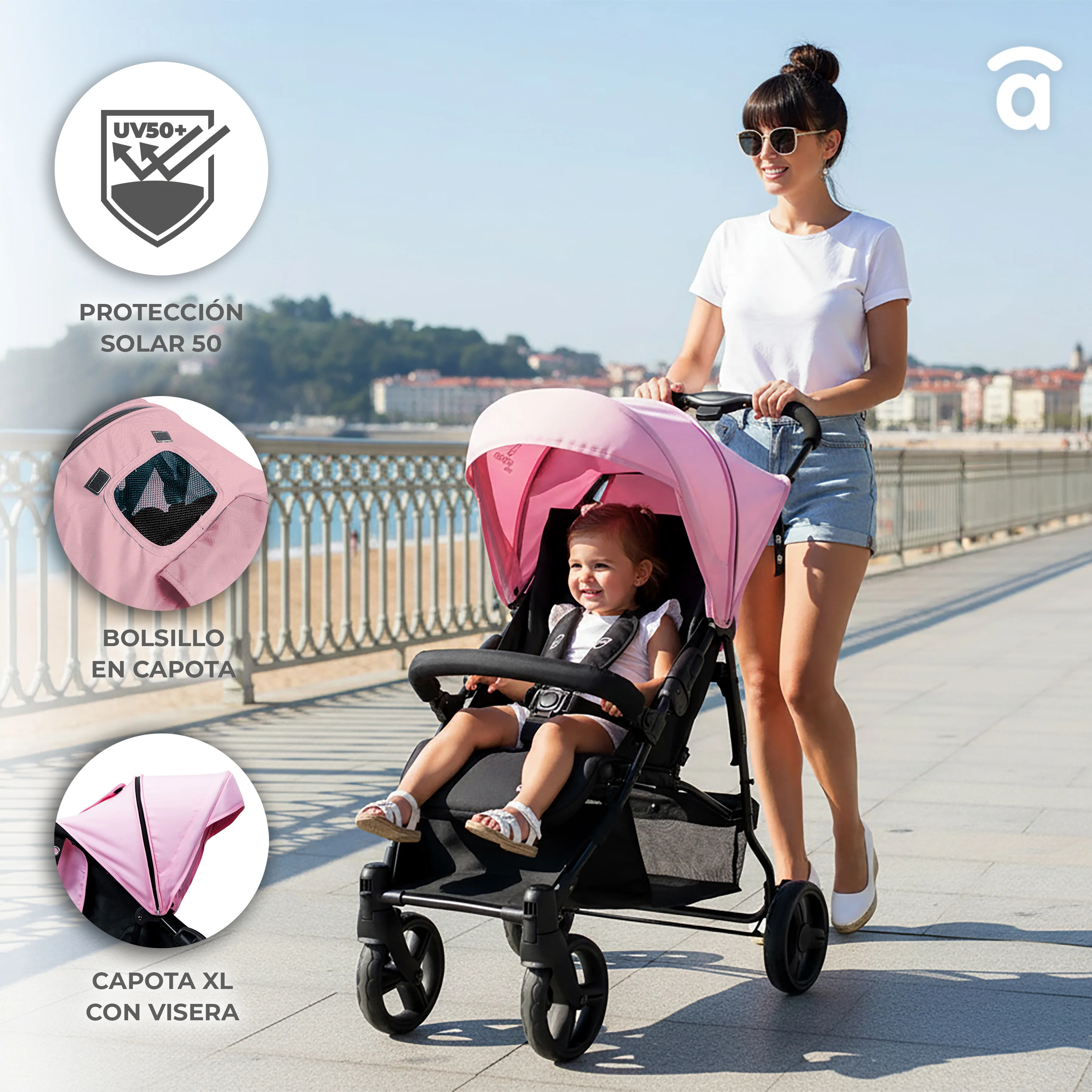 Además, se pliega y despliega con una mano, tiene ruedas fijas y giratorias, y freno trasero único para mayor seguridad.