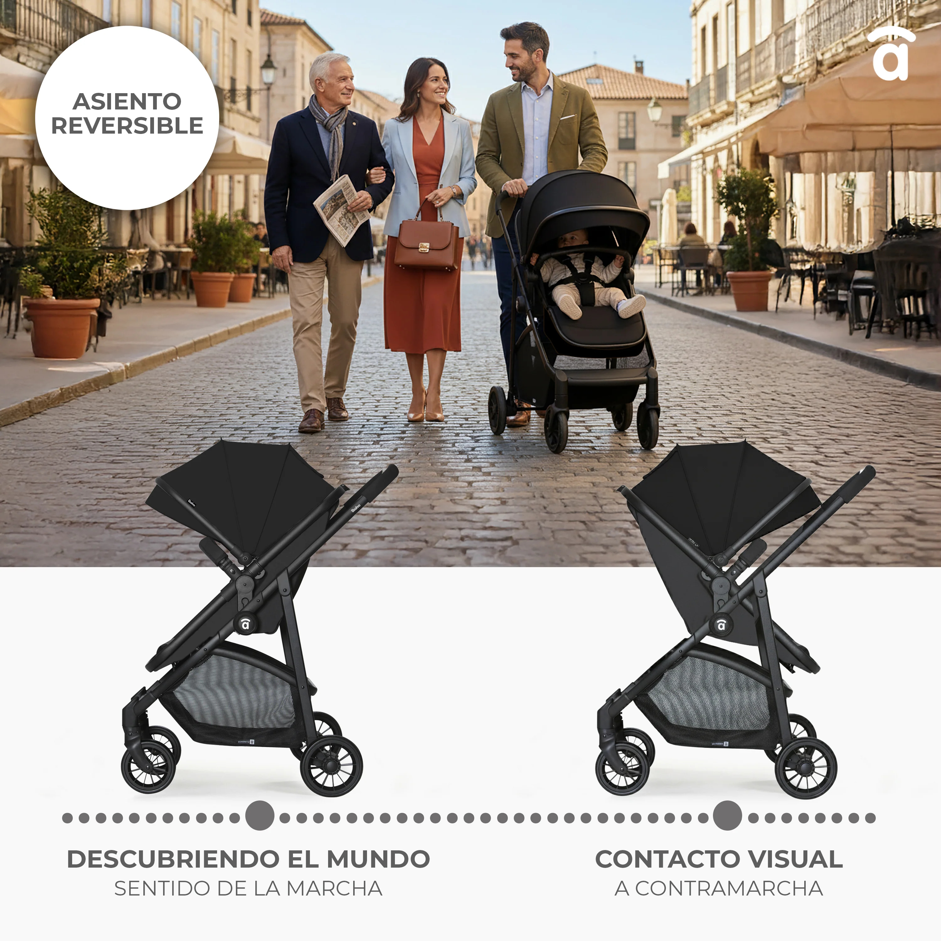 Asiento reversible para usar en sentido contrario y a favor de la marcha.