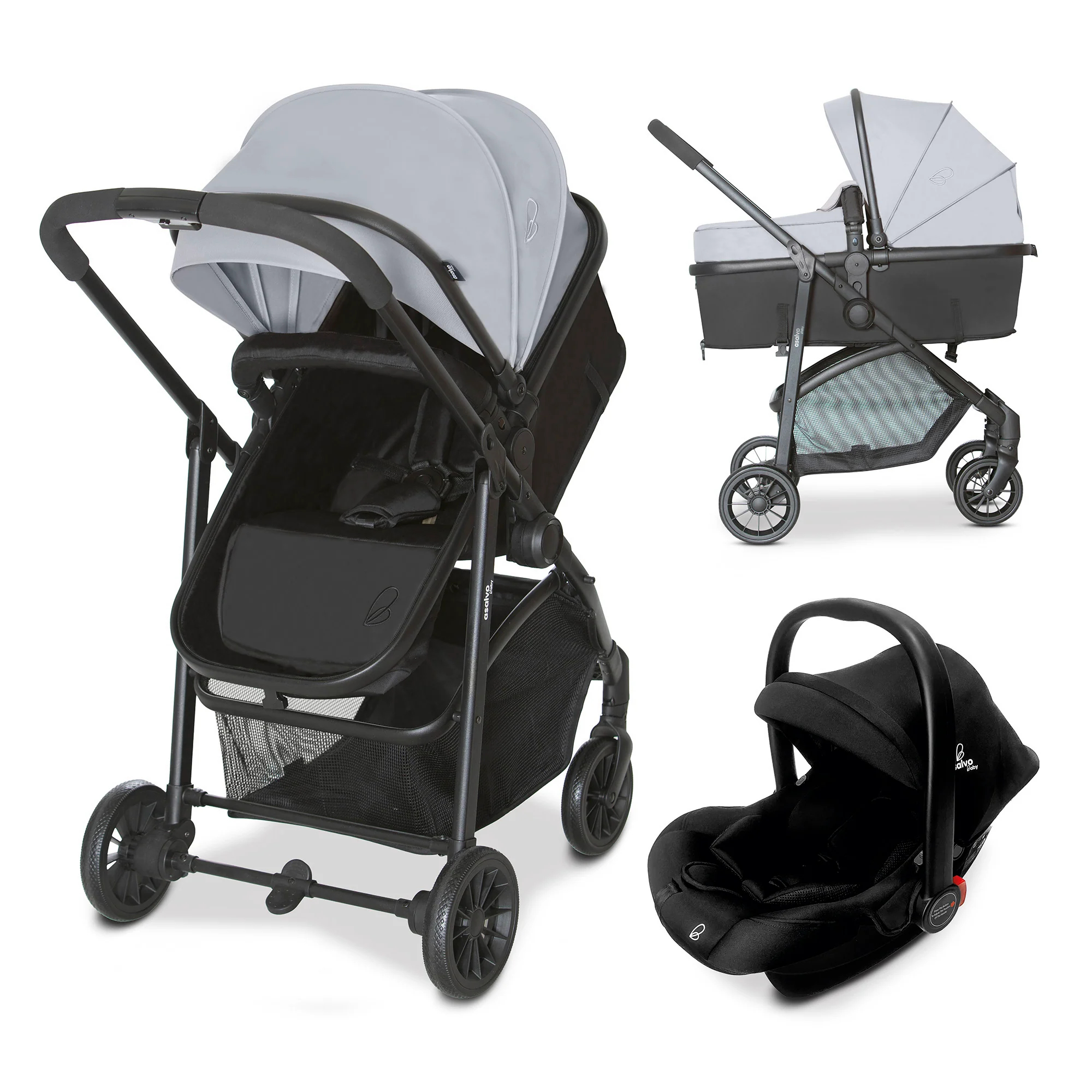 Incluye un asiento convertible que se transforma fácilmente en capazo, cubrepiés y una silla de auto homologada para niños de 40 a 87 cm.