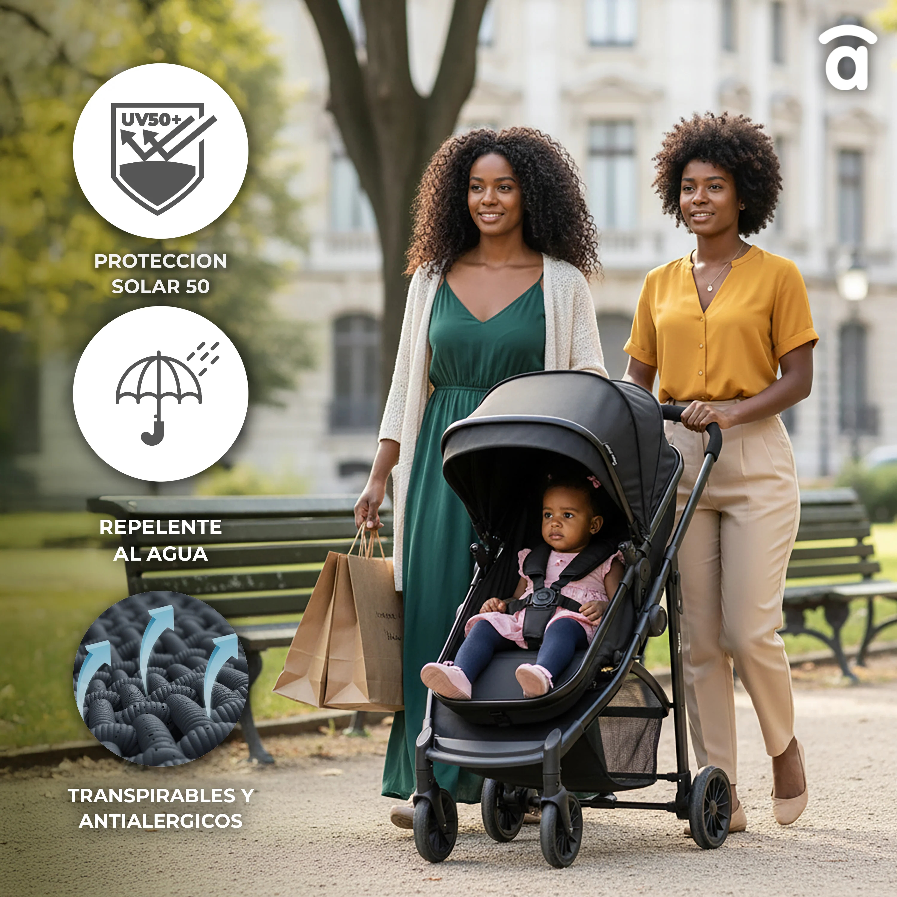 Su capota extensible cuenta con ventana de ventilación, protección contra el agua y rayos UV.