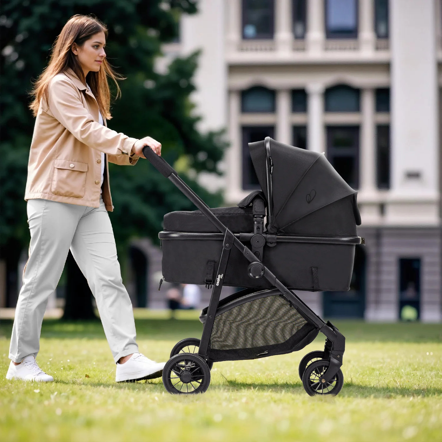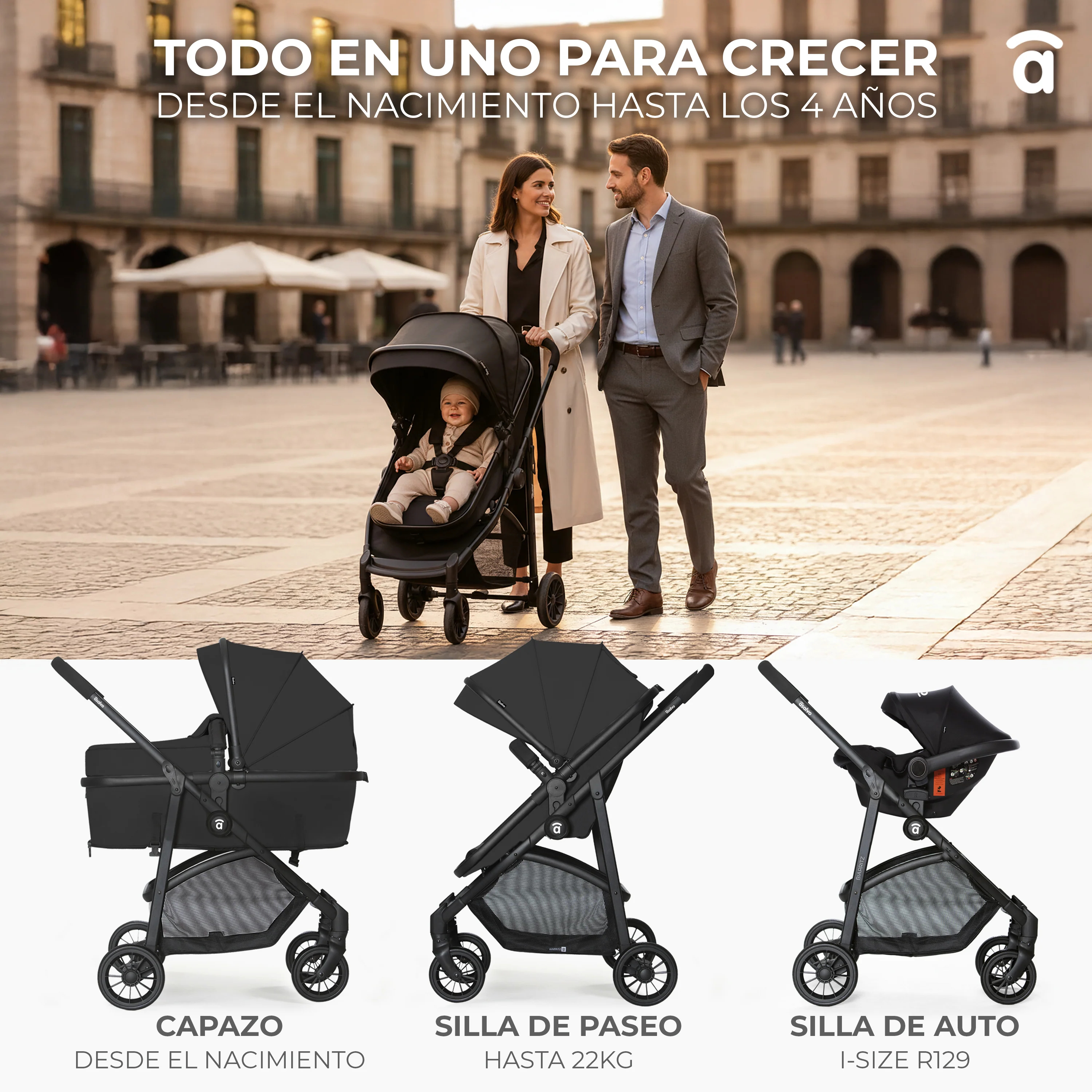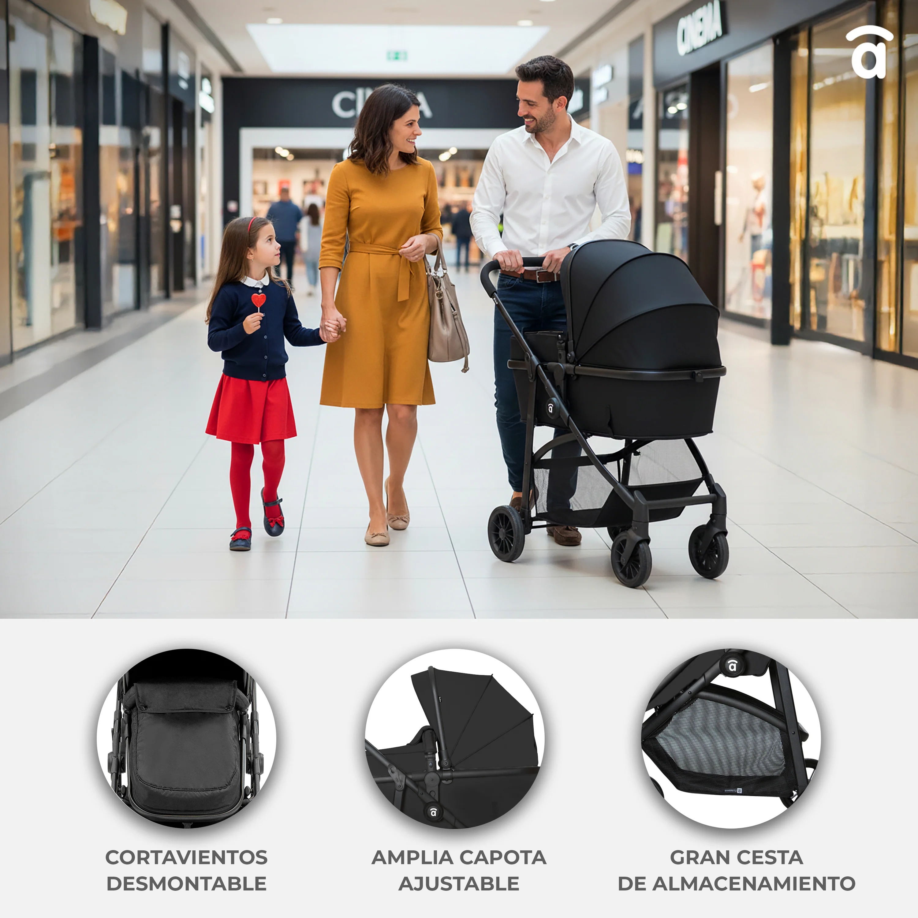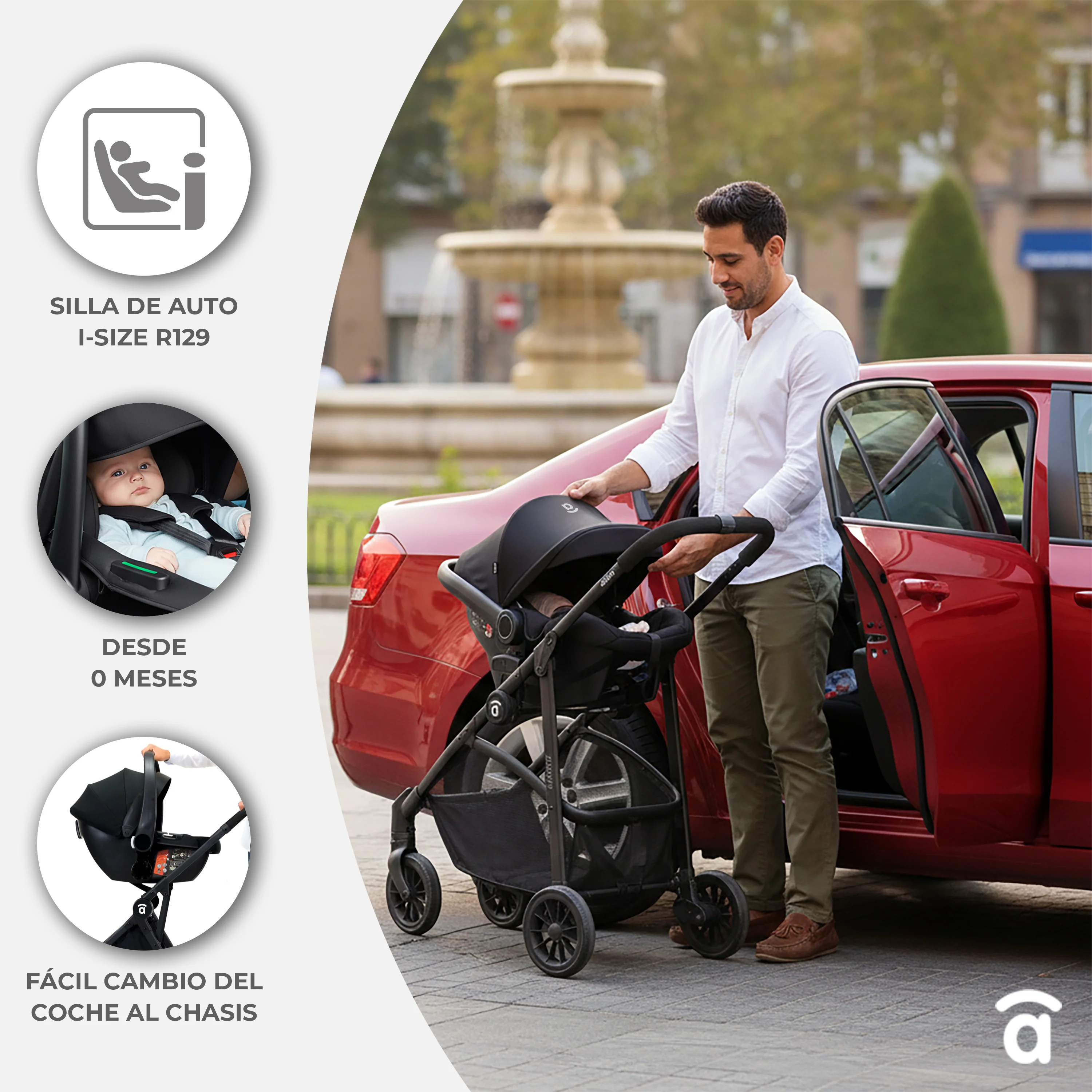 Chasis resistente de acero para máxima durabilidad Arnés de 5 puntos con protectores para la seguridad del bebé Asiento reversible para usar en sentido contrario y a favor de la marcha Barra frontal de seguridad para mayor protección Suspensión en las cuatro ruedas que garantiza un paseo suave Capota extensible con ventana y ventilación para mayor confort Bloqueo de seguridad para un plegado seguro y práctico Manillar cerrado para mejor control y manejo Gran cesta portaobjetos Freno trasero sencillo para un uso cómodo
