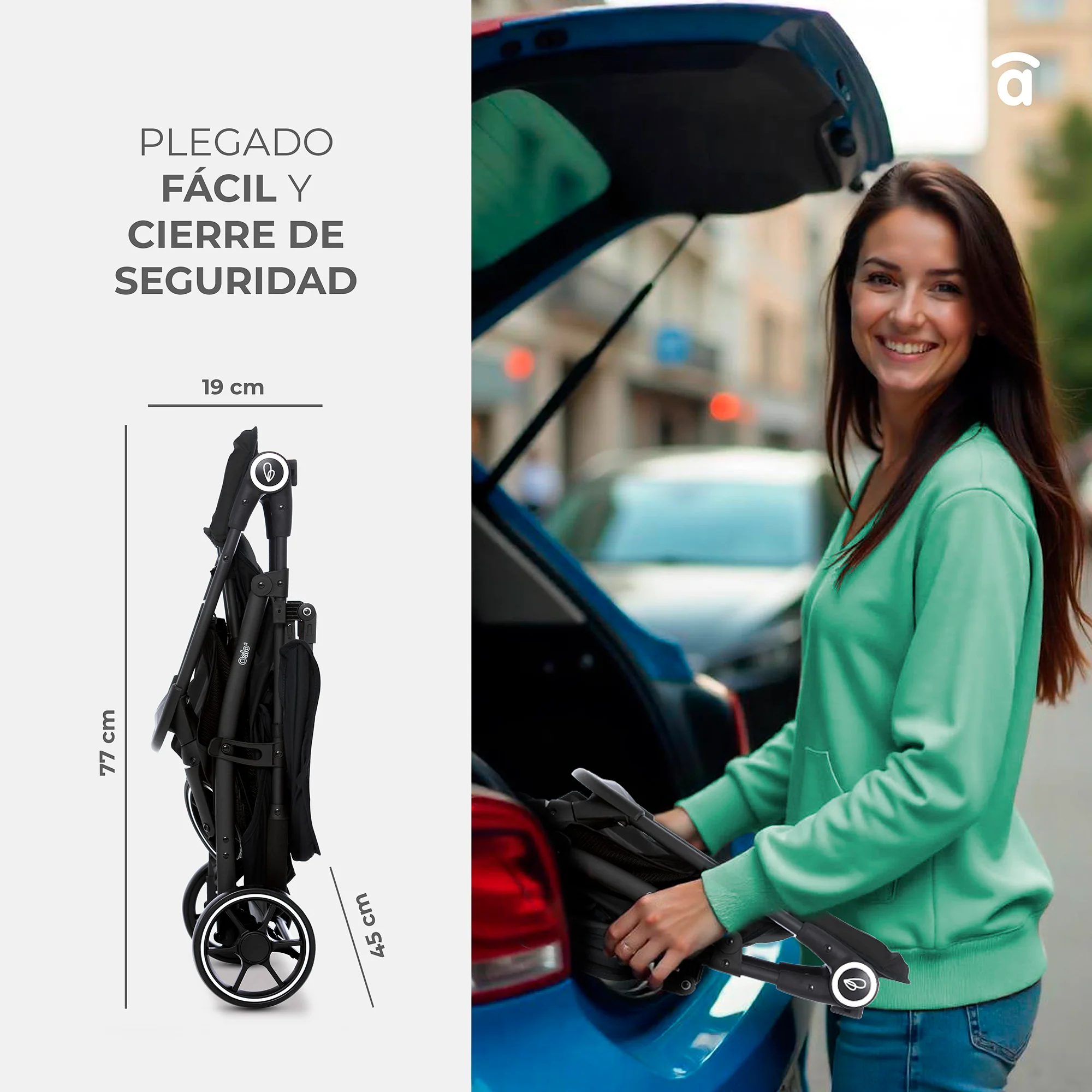 Fácil de plegar con una mano, con cierre de seguridad, y textil lavable a máquina para mayor comodidad y practicidad.